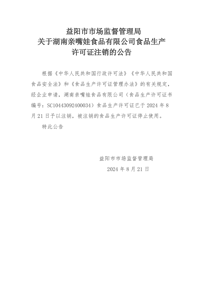 | 关于湖南亲嘴娃食品有限公司食品生产许可证注销的公告 |