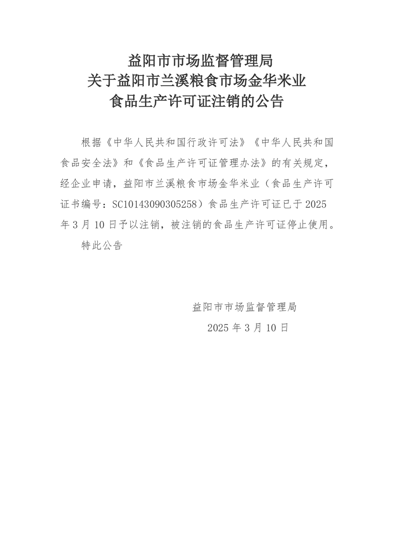 | 关于益阳市兰溪粮食市场金华米业食品生产许可证注销的公告 |