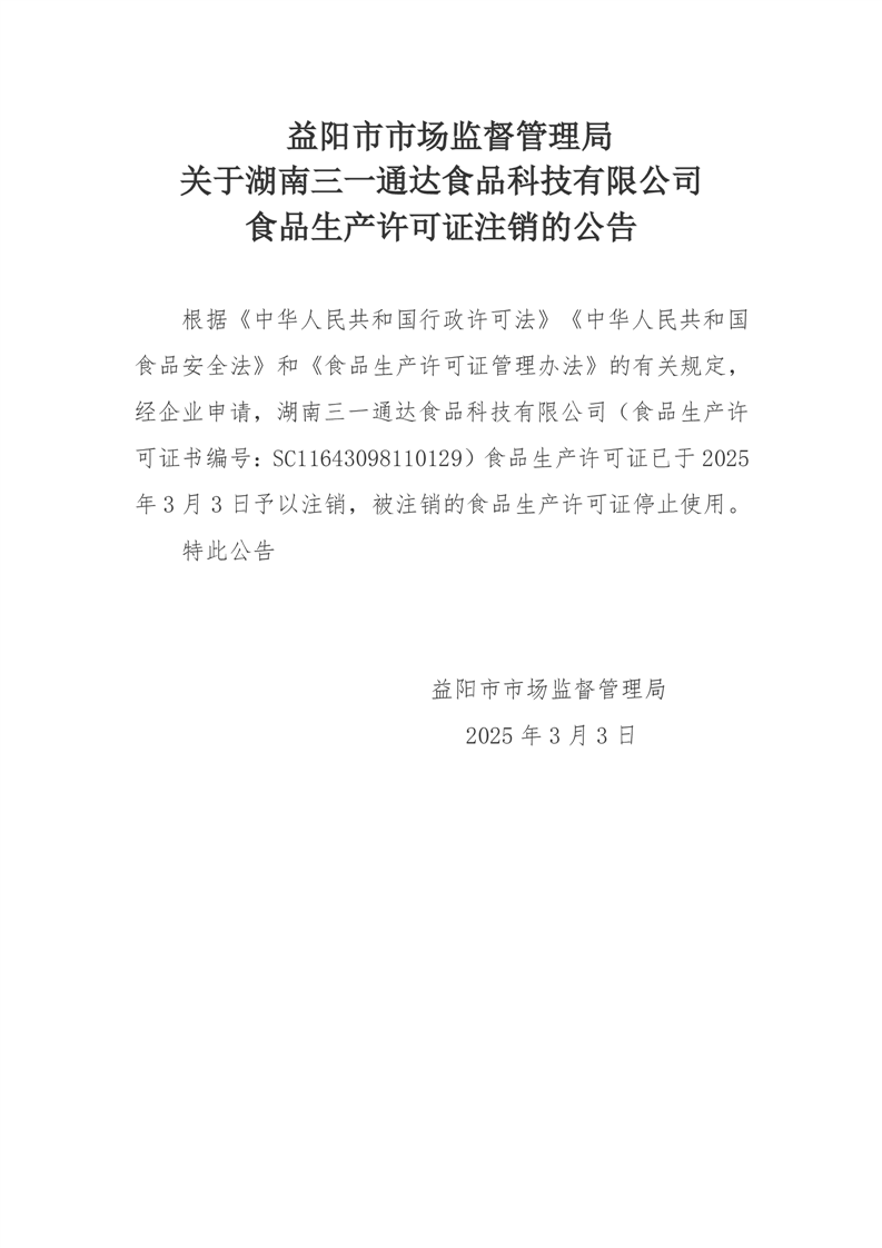 | 关于湖南三一通达食品科技有限公司食品生产许可证注销的公告 |