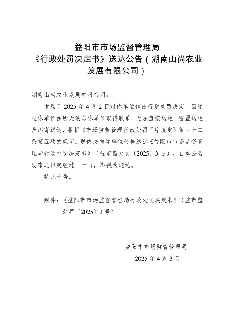 《行政处罚决定书》送达公告(湖南山尚农业发展有限公司)