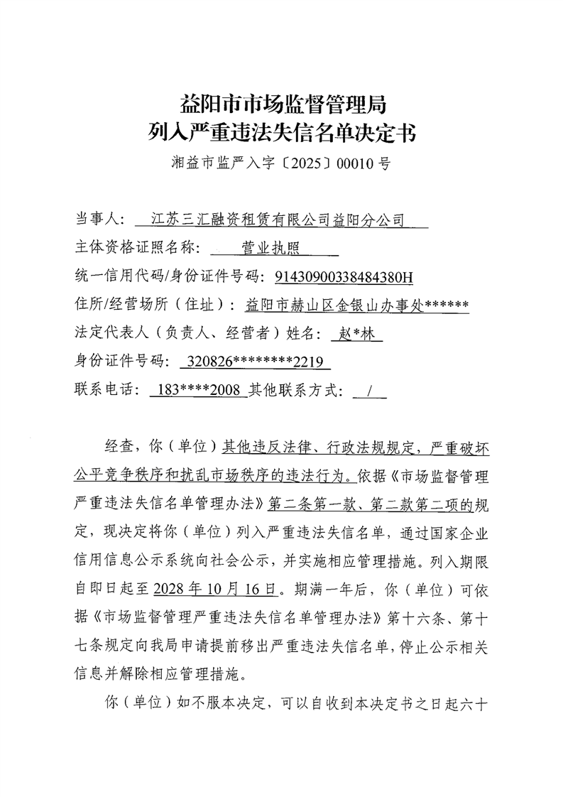 | 送达公告(益市监送告[2025]14-2号)(江苏三汇融资租赁有限公司益阳分公司) |