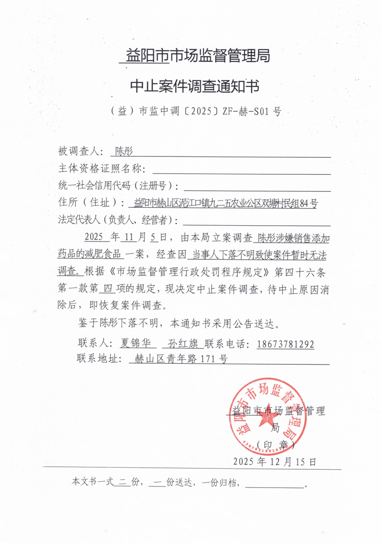 | 益阳市市场监督管理局中止案件调查通知书(陈彤) |