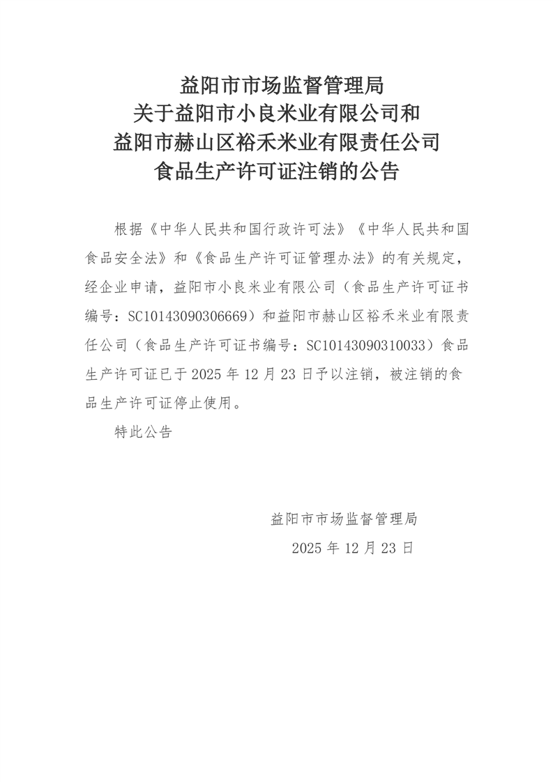 | 关于益阳市小良米业有限公司和益阳市赫山区裕禾米业有限责任公司食品生产许可证注销的公告 |