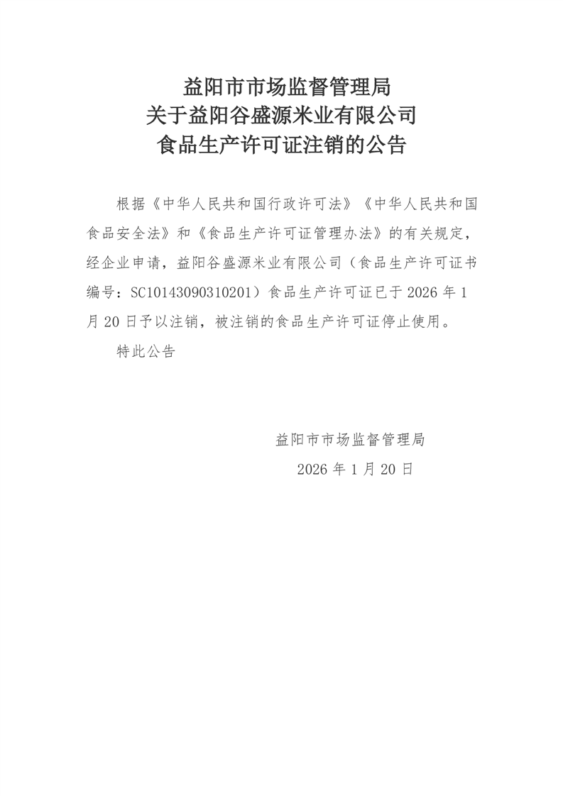 | 关于益阳谷盛源米业有限公司食品生产许可证注销的公告 |