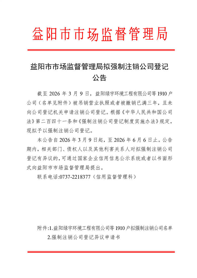 | 益阳市市场监督管理局拟强制注销公司登记公告(2026年第1批) |