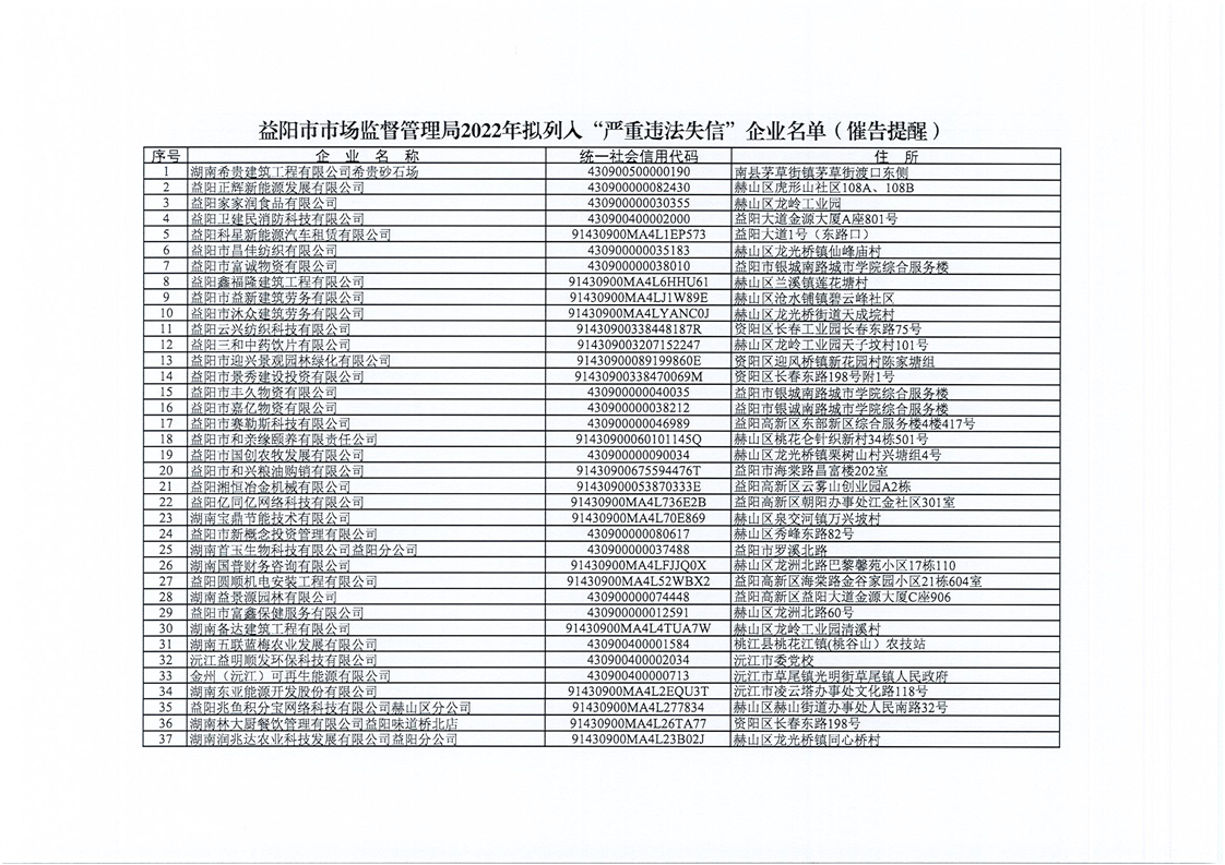 | 益阳市市场监督管理局2022年拟列入“严重违法失信”企业名单(催告提醒) |