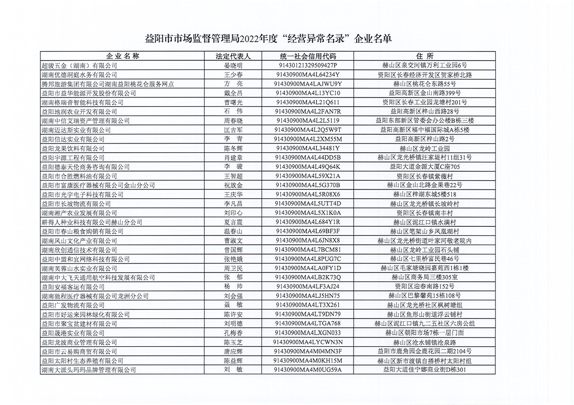 | 益阳市市场监督管理局2022年度“经营异常名录”企业名单 |