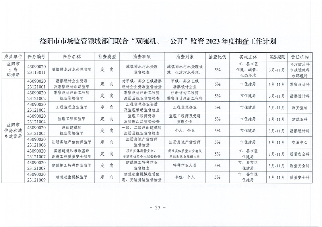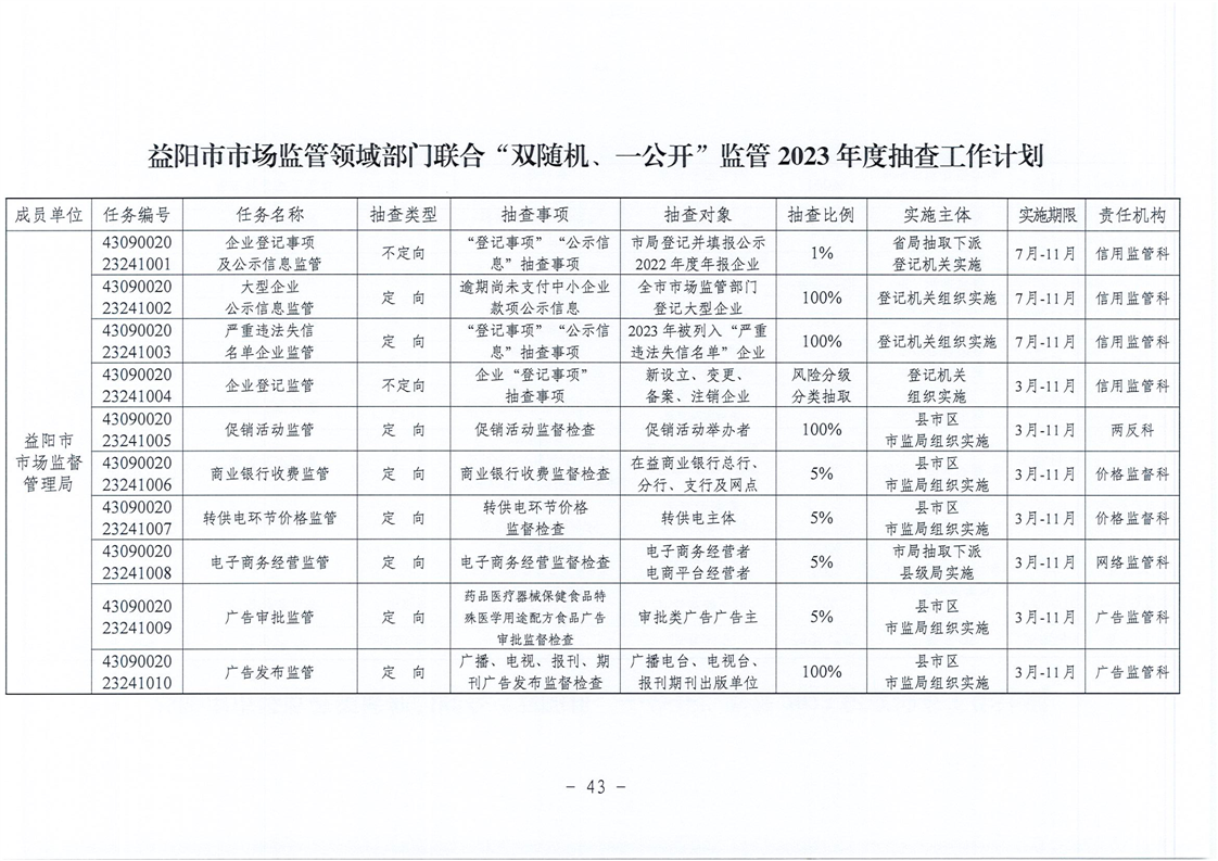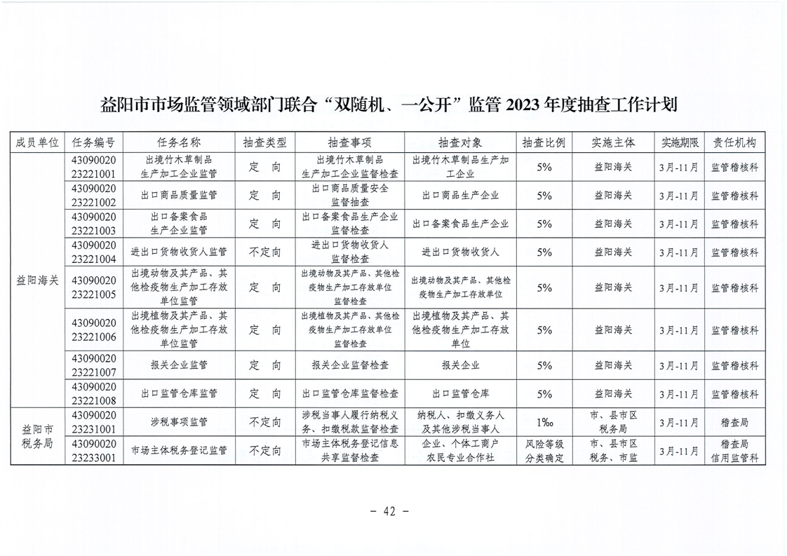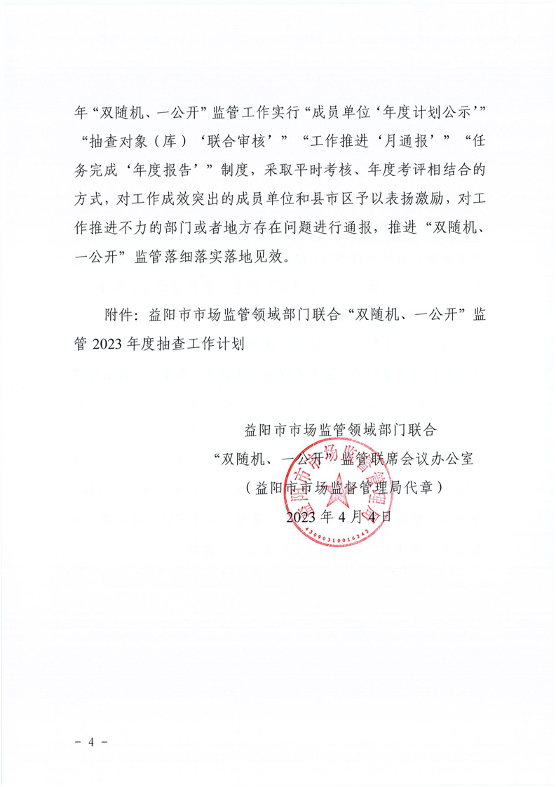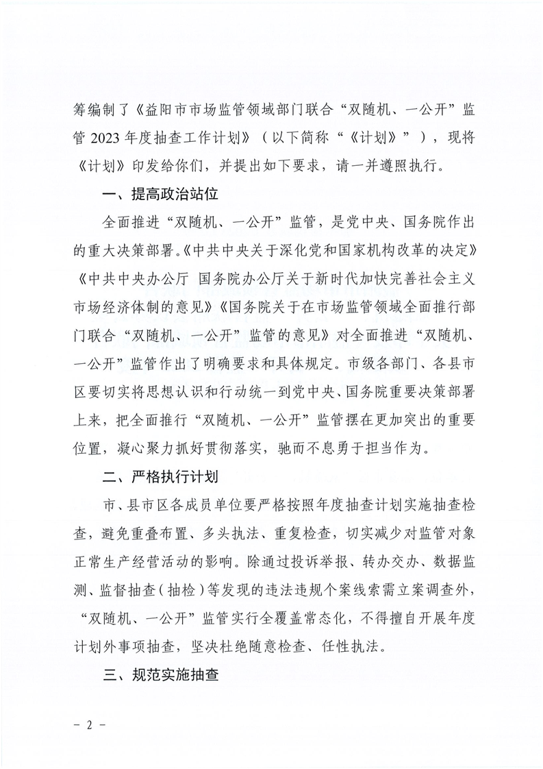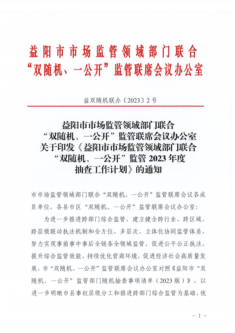 | 关于印发《益阳市市场监管领域部门联合“双随机、一公开”监管2023年度抽查工作计划》的通知 |