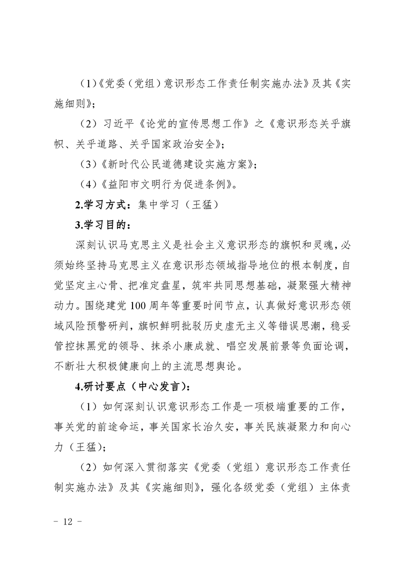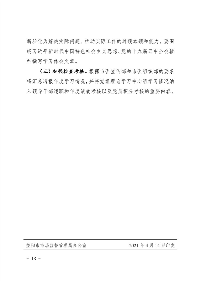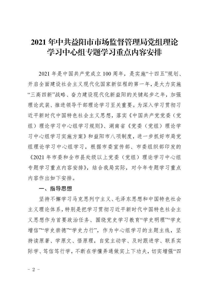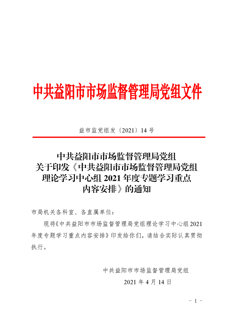 | 关于印发《中共益阳市市场监督管理局党组理论学习中心组2021年度专题学习重点内容安排》的通知 |