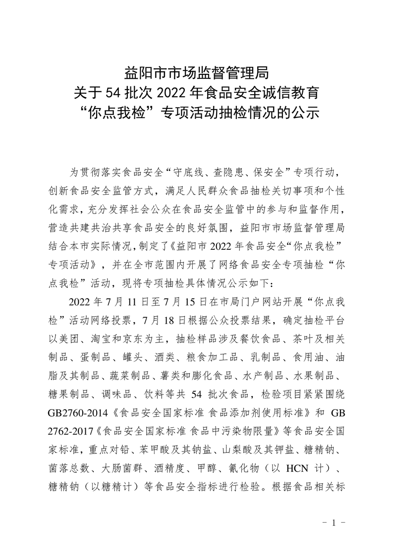 | 关于54批次2022年食品安全诚信教育“你点我检”专项活动抽检情况的公示 |