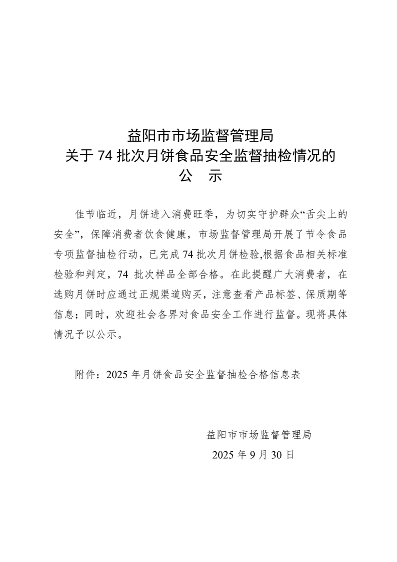 | 关于74批次月饼食品安全监督抽检情况的公示(2025年中秋节) |