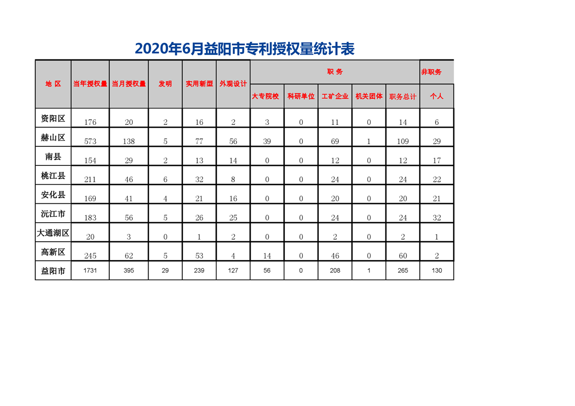 | 2020年6月益阳市专利授权量统计表 |
