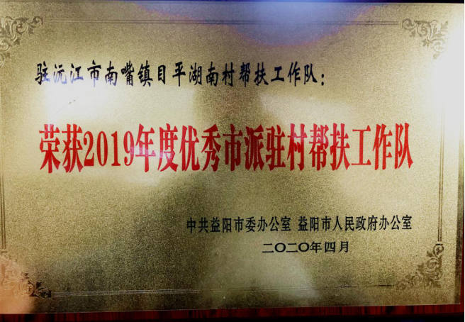 荣获益阳市“2019年度优秀市派驻村帮扶工作队” 该村的专业合作社与贫困户建立利益联结机制,通过委托帮扶的方式,在湖南农夫科技有限公司投资72.5万元,平均年回报率达到16%。 2019年,村委对村集体渔场进行了重新发包,村级集体收入也有了充分的保障,目前,村集体经济收入已达10万元以上。产业委托帮扶既让贫困户产生效益,更重要的是国家投入的产业帮扶资金得到了保质保值,确保了产业资金不会流失。 2018年,工作队通过走访发现了许多薄弱环节,特别是结对帮扶这一块,直接影响贫困户脱贫的质量。为此,各单位分别向挂帅领导递交了责任状,结对帮扶责任人向单位递交了责任状。结对帮扶责任人通过月度走访,详细了解了贫困户的致贫原因,家庭现状和适合脱贫的路径,分别制定了帮扶计划。全村建档立卡的109户贫困户,除3户实行政策兜底外,其他106户均实现了“一超过两不愁三保障”的目标。 经过两年的结对帮扶,帮扶责任人与贫困户之间产生了深厚的友谊。正是因为有这样一群真心为贫困户付出,为他们解惑的帮扶责任人,才让这里的贫困户心热起来了,脱贫的干劲也足起来了。 因工作突出,群众认可度高,驻目平湖南村帮扶工作队被评为益阳市“2019年度优秀市派驻村帮扶工作队”。