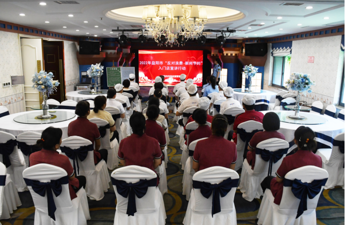 为弘扬勤俭节约传统美德,遏制铺张浪费行为,7月28日,益阳市市场监管局走进爱禧汇主题宴会酒店开展“反对浪费 崇尚节约”宣讲行动,通过主题宣讲、现场检查,引导餐饮单位树立爱粮节粮意识。