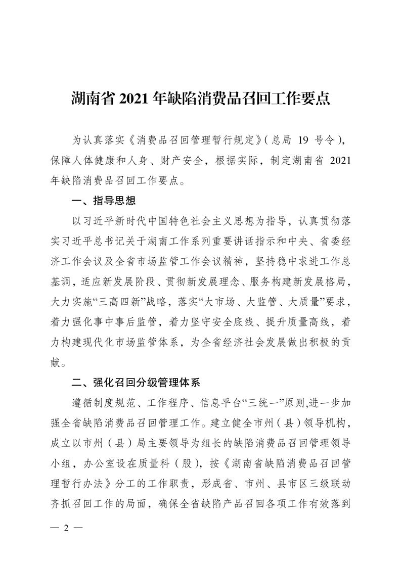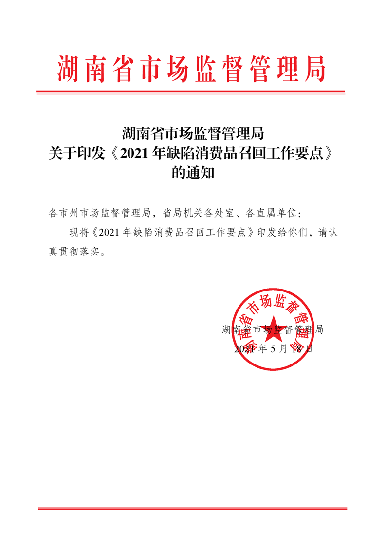 | 湖南省市场监督管理局关于印发《2021年缺陷消费品召回工作要点》的通知 |