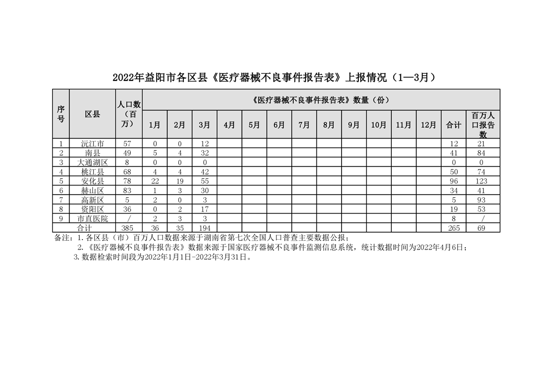 | 【监测进度】2022年益阳市各区县《医疗器械不良事件报告表》上报情况(1—3月) |