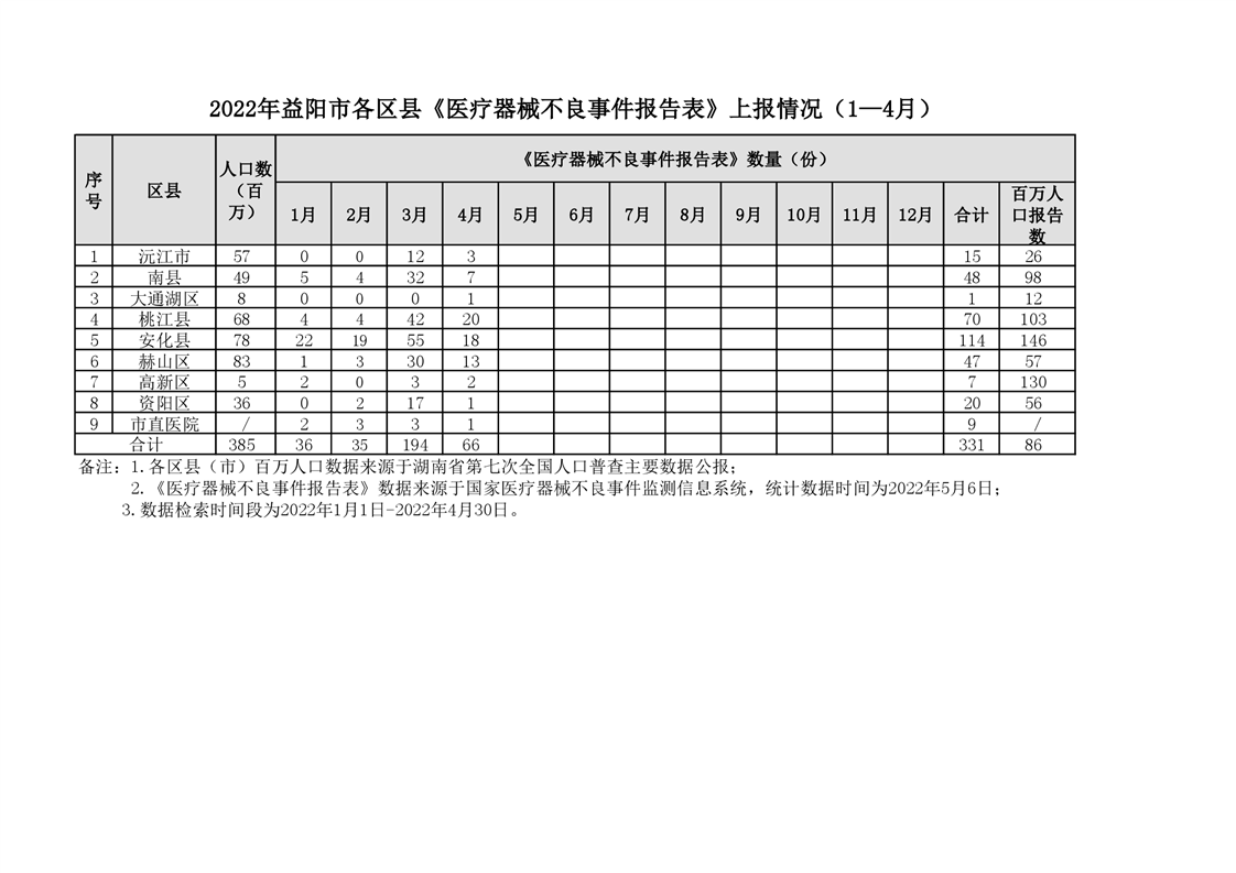 | 【监测进度】2022年益阳市各区县《医疗器械不良事件报告表》上报情况(1—4月) |