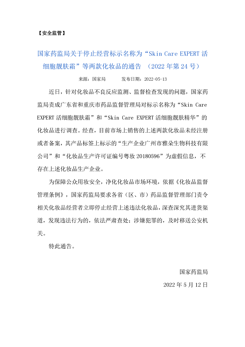 | 【安全监管】国家药监局关于停止经营标示名称为“Skin Care EXPERT活细胞靓肤霜”等两款化妆品的通告(2022年第24号) |