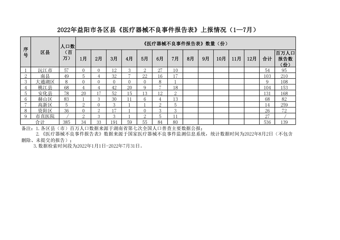 | 【监测进度】2022年益阳市各区县《医疗器械不良事件报告表》上报情况(1—7月) |