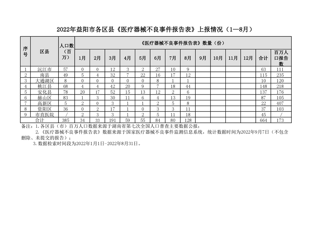 | 【监测进度】2022年益阳市各区县《医疗器械不良事件报告表》上报情况(1—8月) |