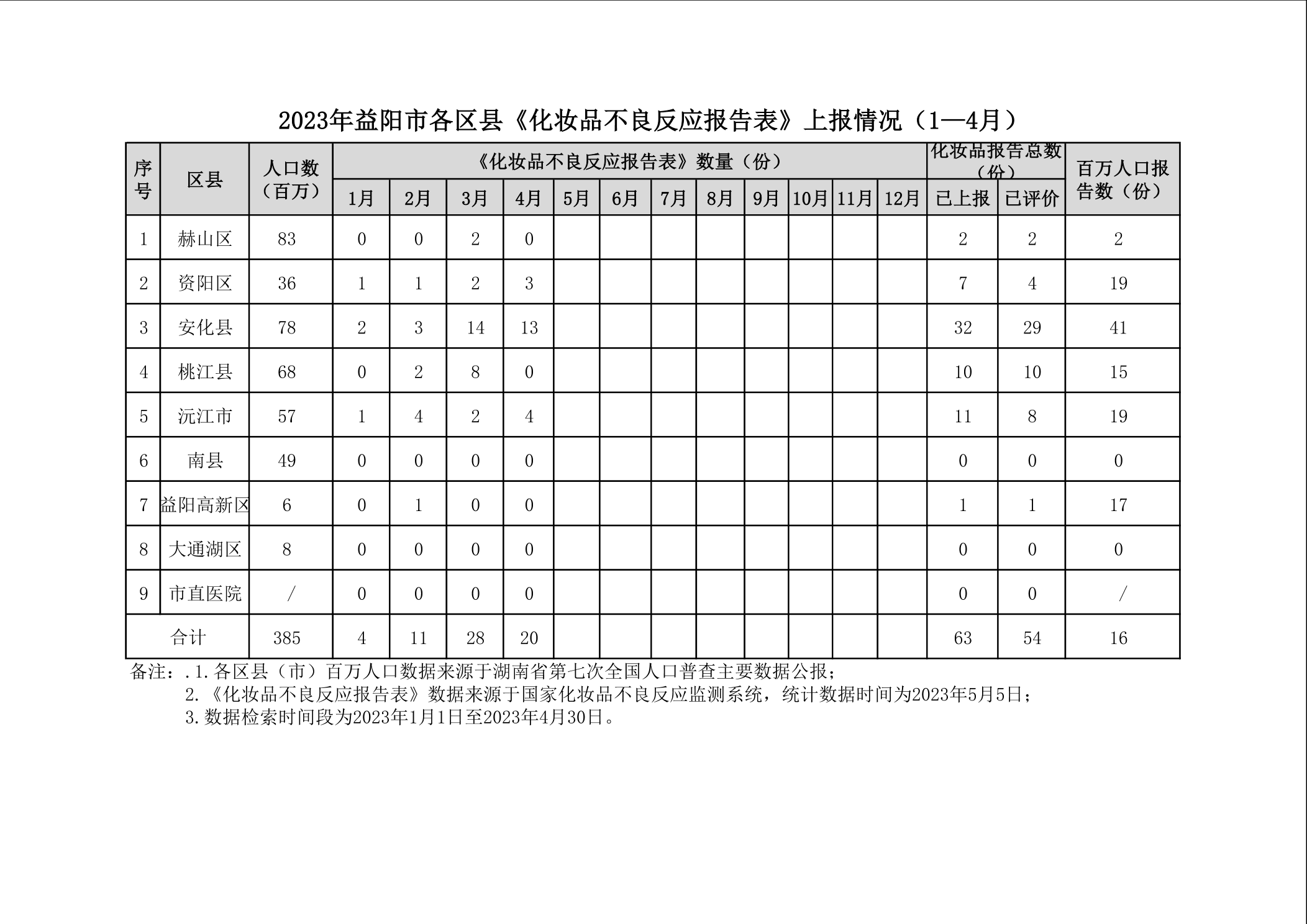 | 2023年益阳市各区县《化妆品不良反应报告表》上报情况(1—4月) |