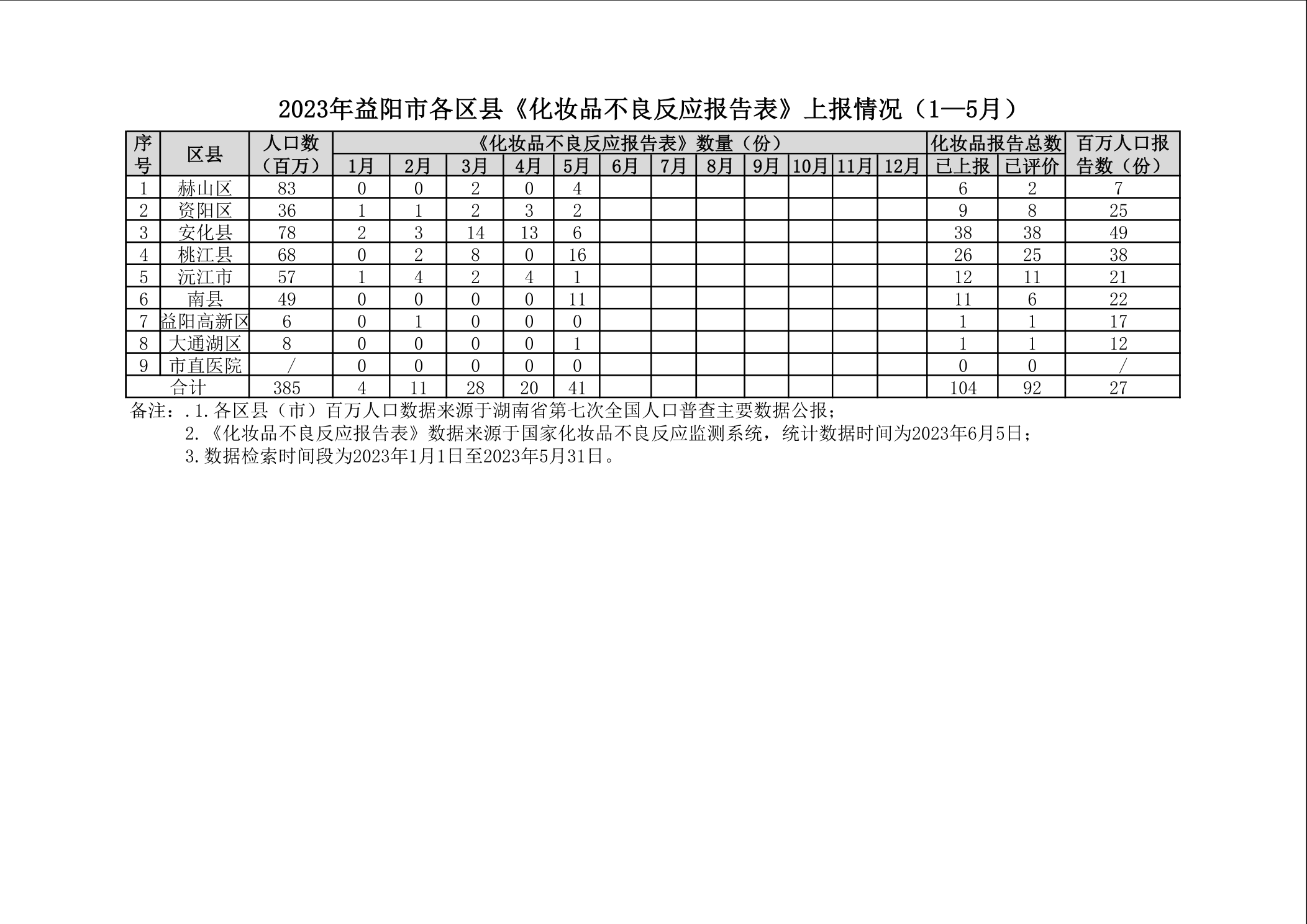 | 2023年益阳市各区县《化妆品不良反应报告表》上报情况(1—5月) |