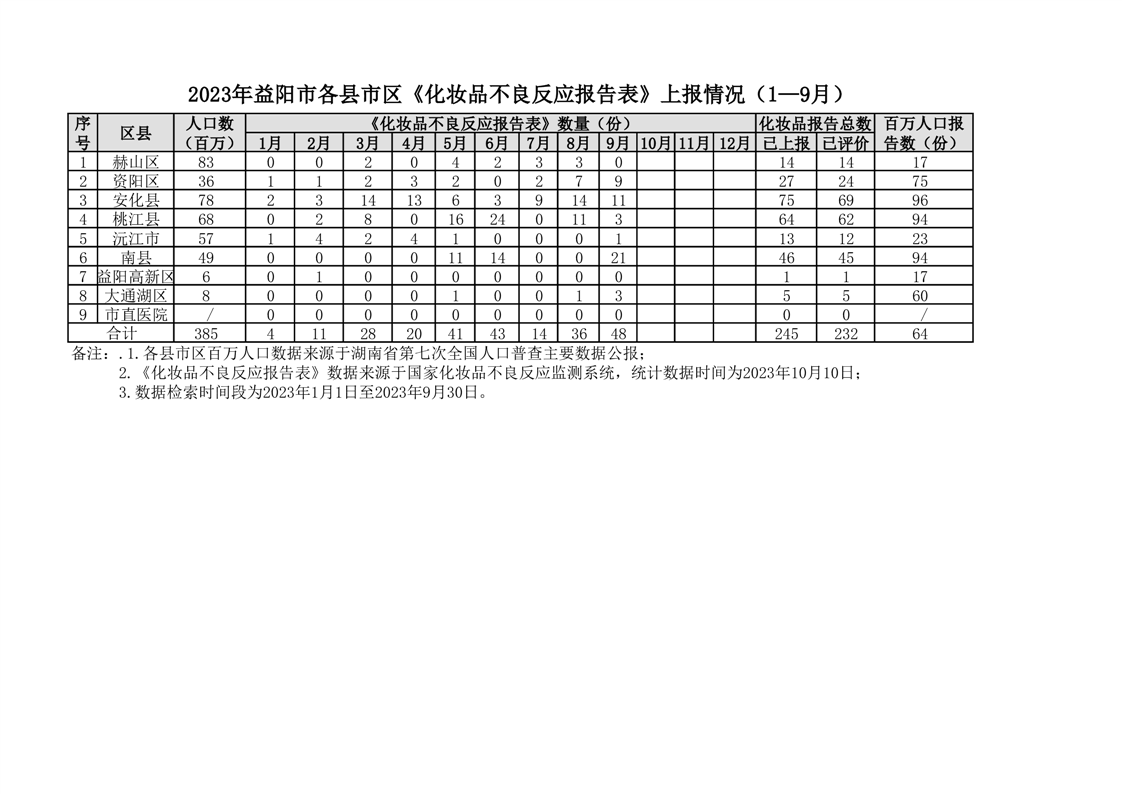 | 2023年益阳市各区县《化妆品不良反应报告表》上报情况(1—9月) |