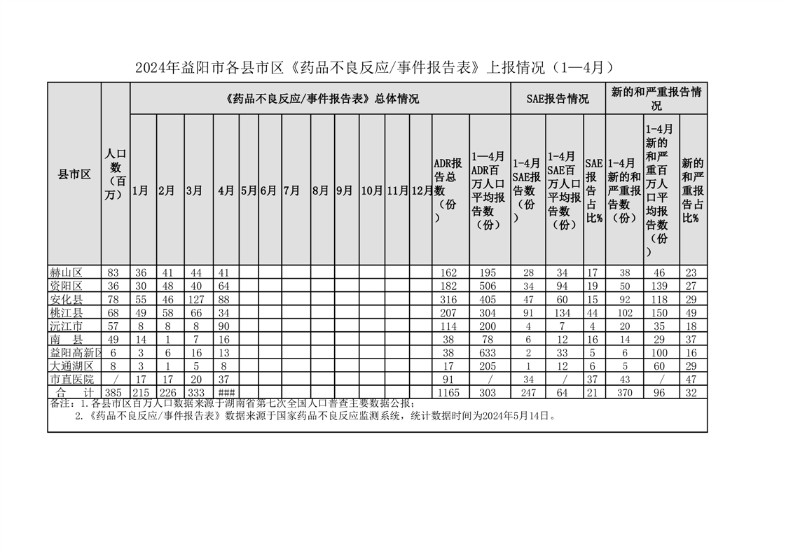 | 2024年益阳市各区县《药品不良反应事件报告表》上报情况(1—4月) |