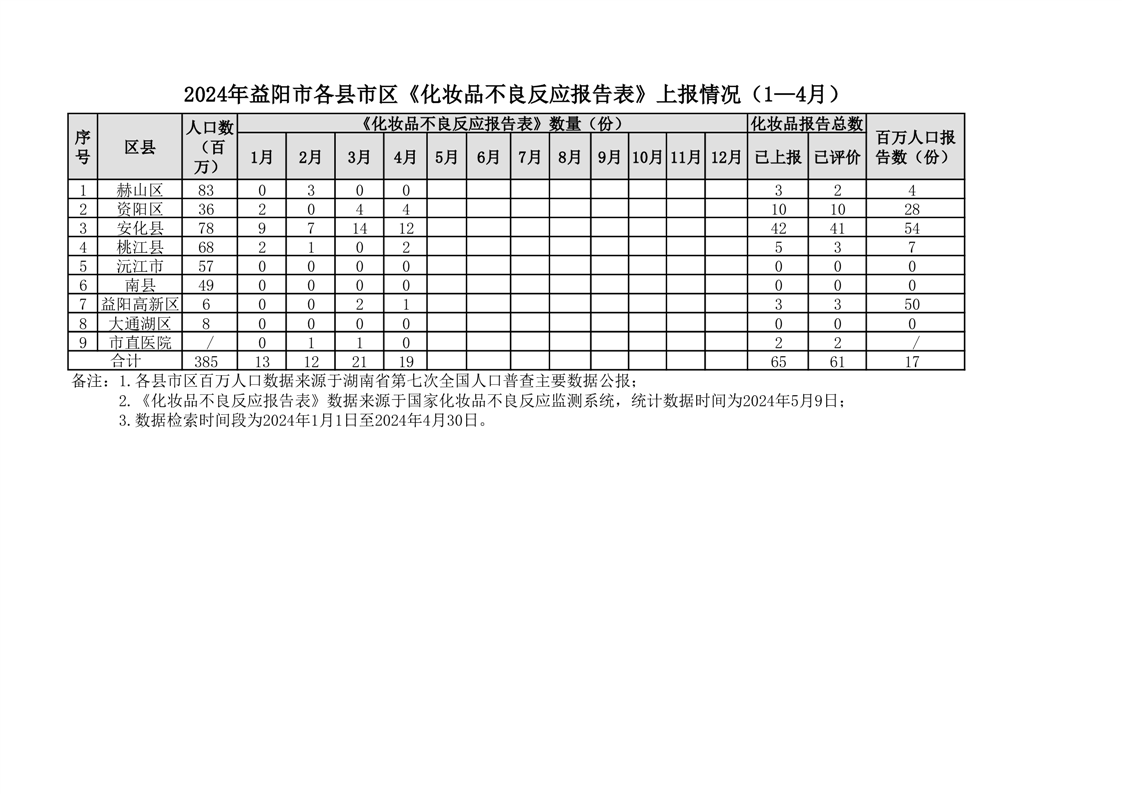 | 2024年益阳市各区县《化妆品不良反应报告表》上报情况(1—4月) |