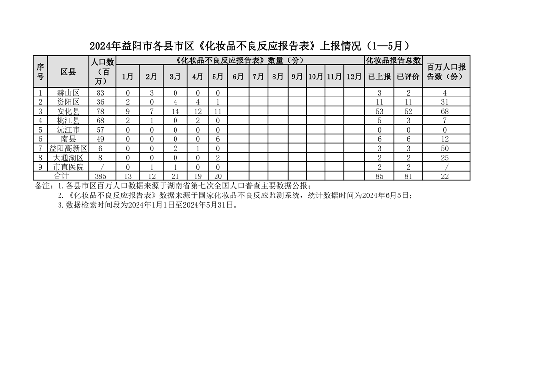 | 2024年益阳市各区县《化妆品不良反应报告表》上报情况(1—5月) |
