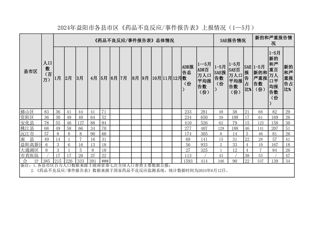 | 2024年益阳市各区县《药品不良反应事件报告表》上报情况(1—5月) |