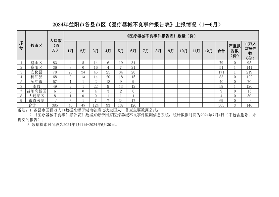 | 2024年益阳市各区县《医疗器械不良事件报告表》上报情况(1—6月) |