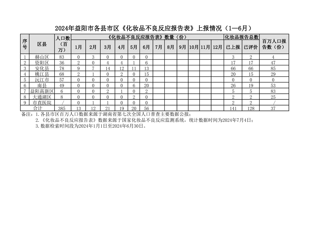 | 2024年益阳市各区县《化妆品不良反应报告表》上报情况(1—6月) |