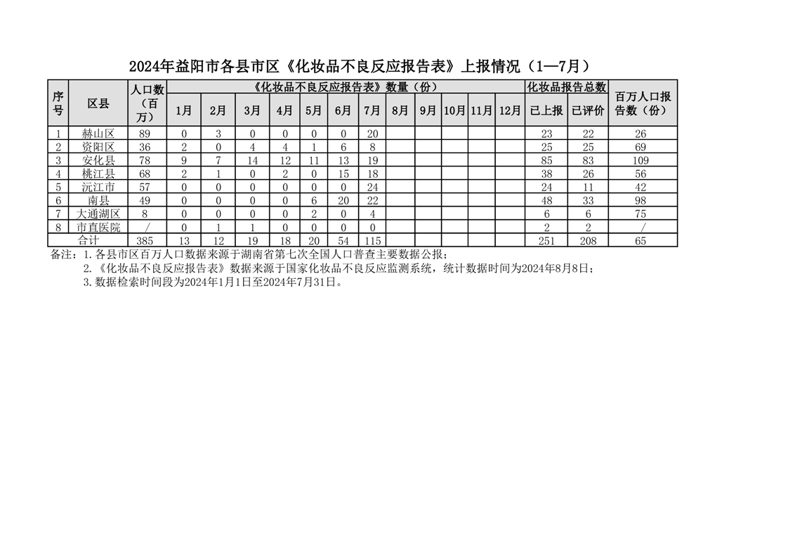 | 2024年益阳市各区县《化妆品不良反应报告表》上报情况(1—7月) |