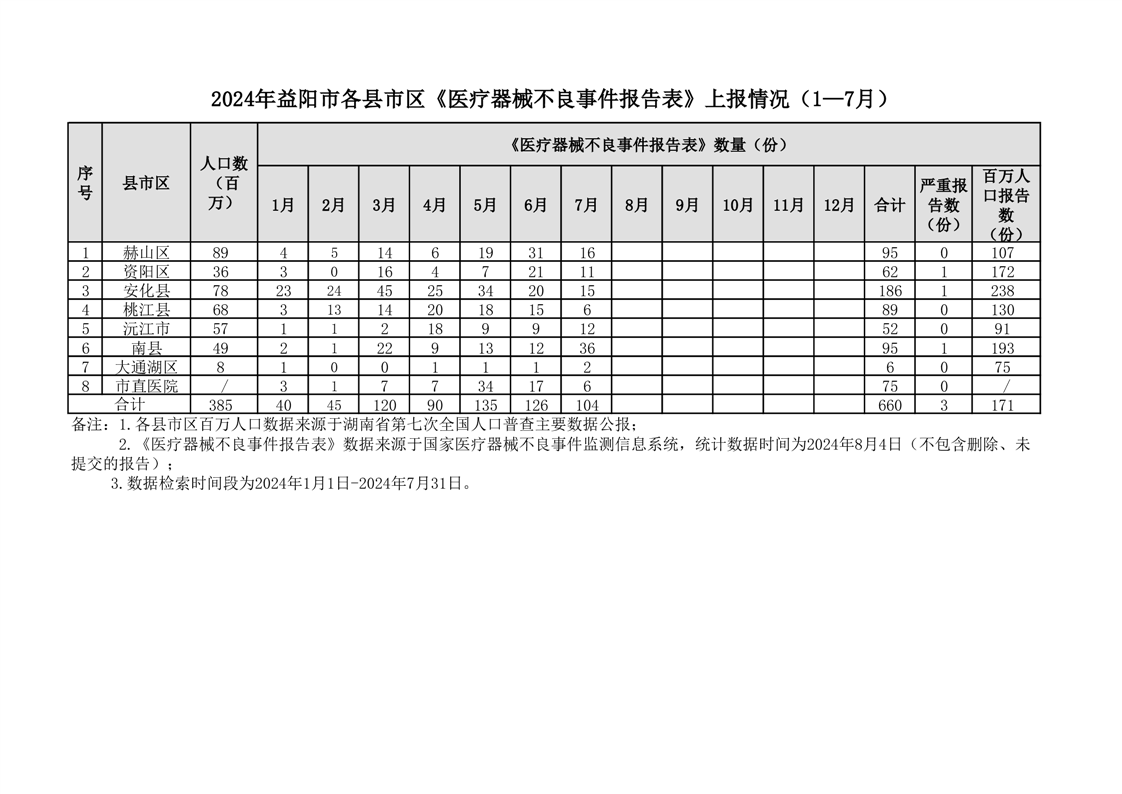 | 2024年益阳市各区县《医疗器械不良事件报告表》上报情况(1—7月) |