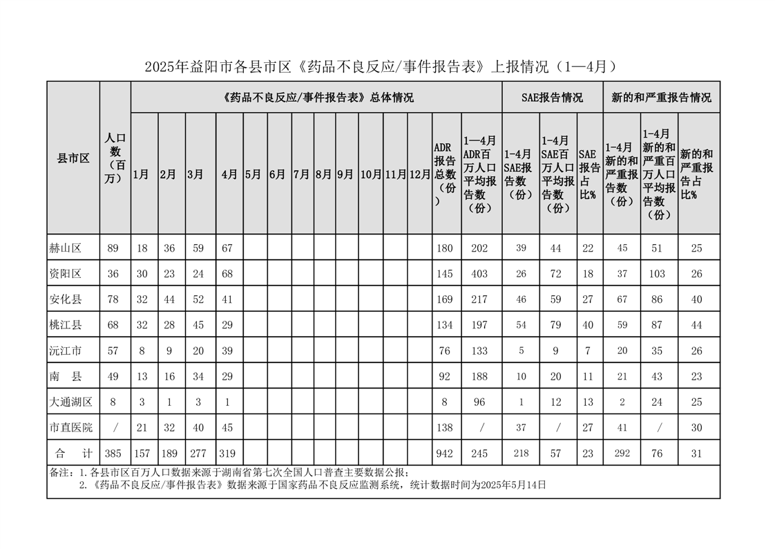 | 2025年益阳市各区县《药品不良反应事件报告表》上报情况(1—4月) |
