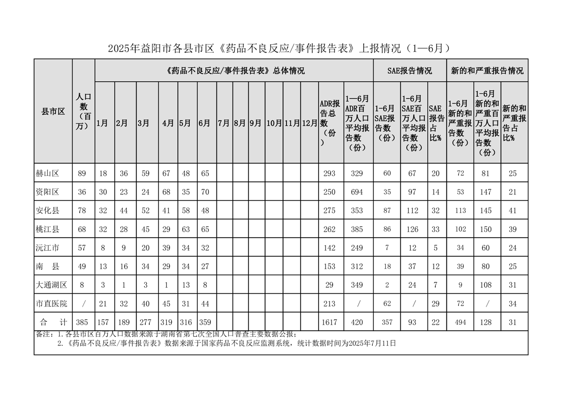 | 2025年益阳市各区县《药品不良反应事件报告表》上报情况(1—6月) |