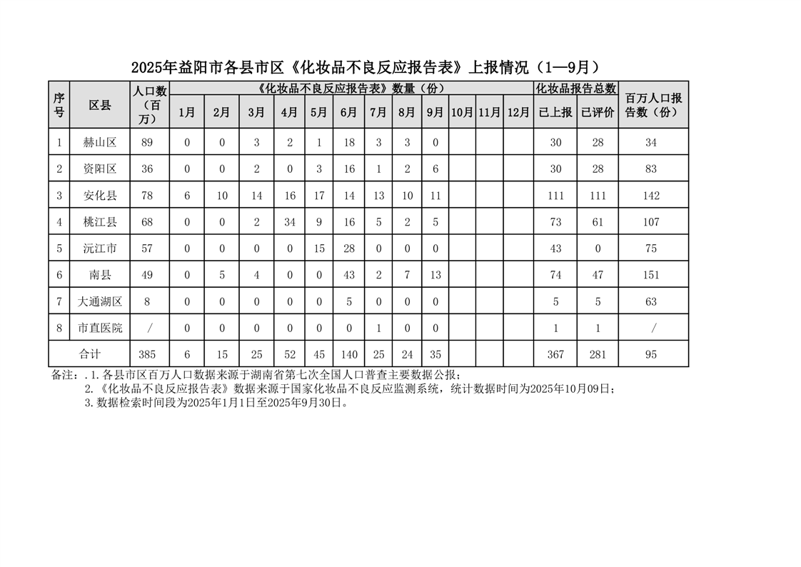| 2025年益阳市各区县《化妆品不良反应报告表》上报情况(1—9月) |