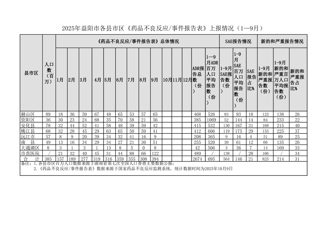 | 2025年益阳市各区县《药品不良反应事件报告表》上报情况(1—9月) |