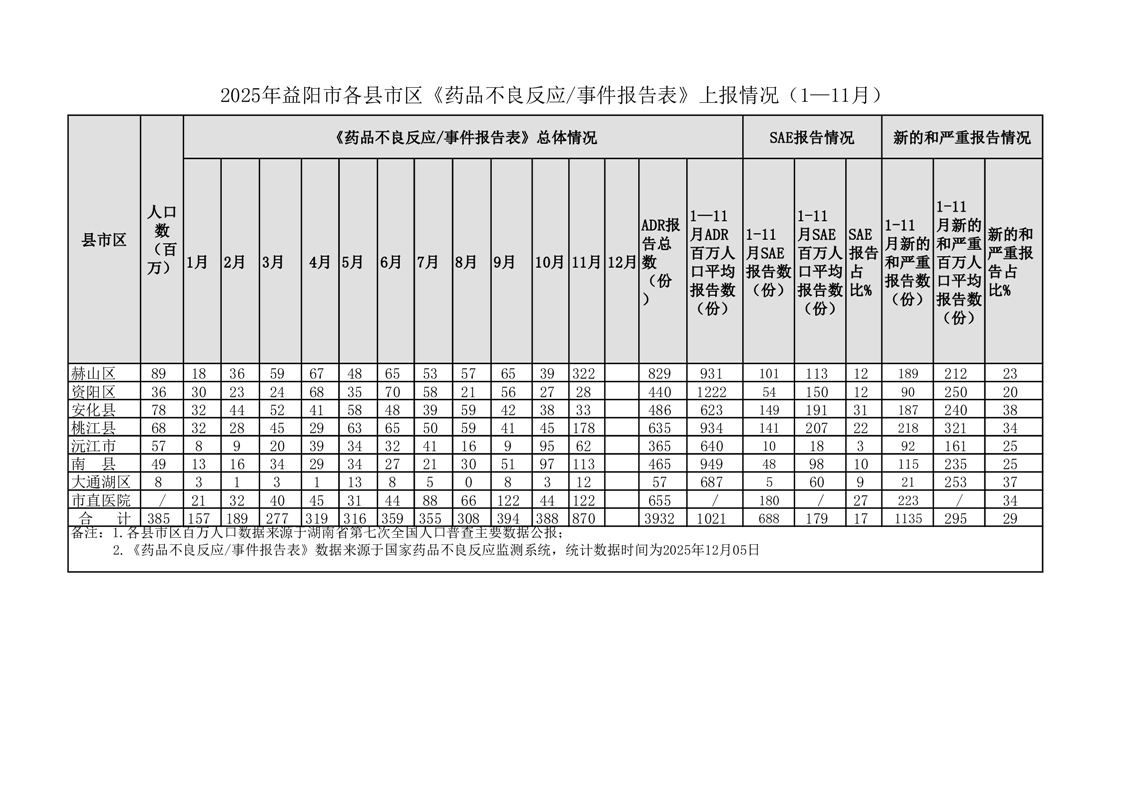 | 2025年益阳市各区县《药品不良反应事件报告表》上报情况(1—11月) |