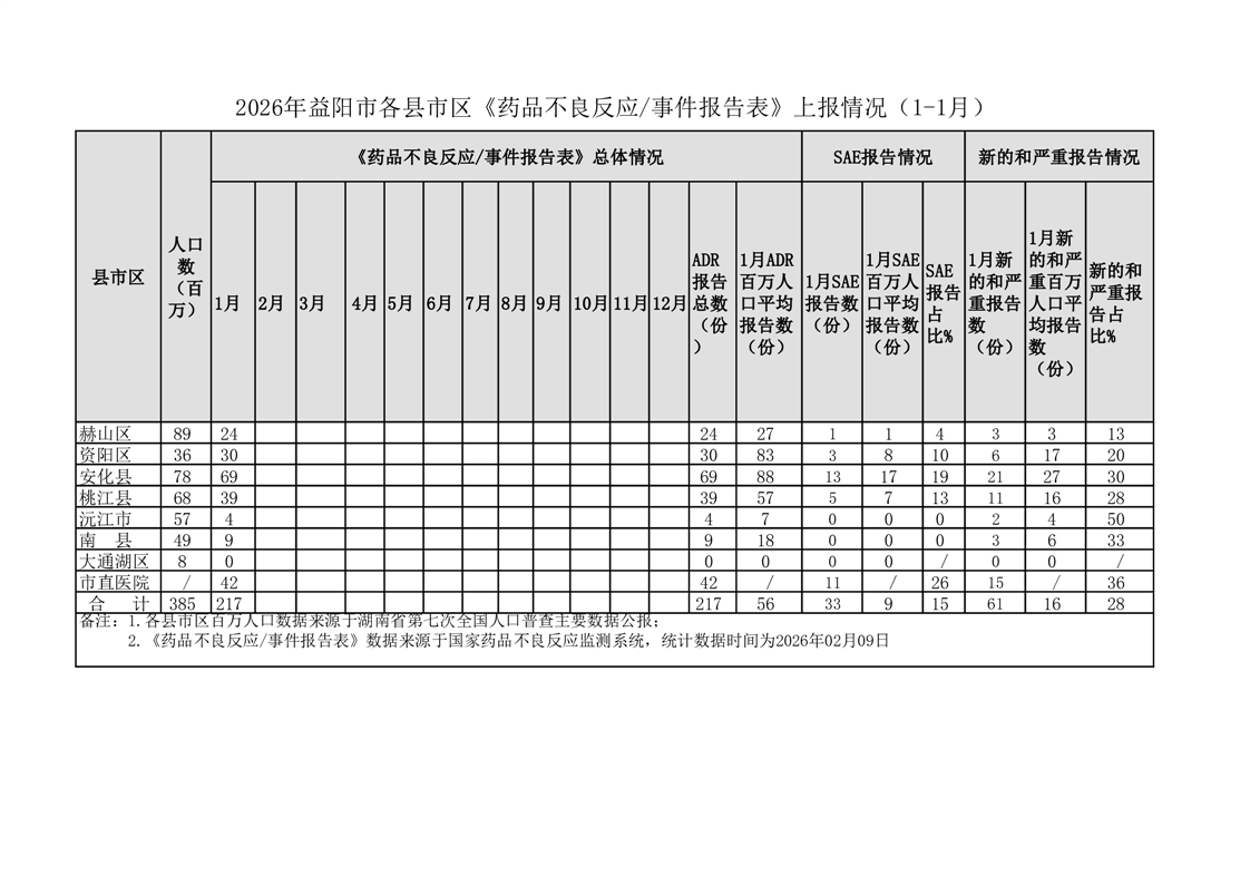 | 2026年益阳市各区县《药品不良反应事件报告表》上报情况(1—1月) |