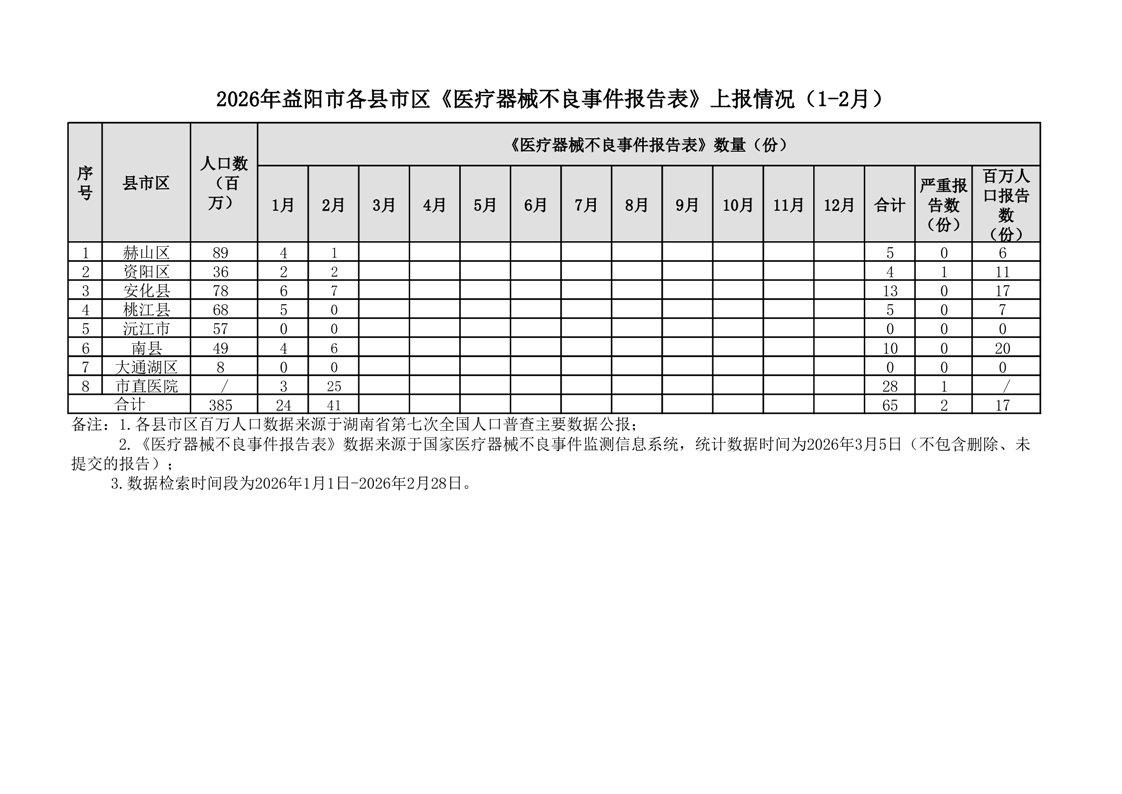 | 2026年益阳市各区县《医疗器械不良事件报告表》上报情况(1—2月) |