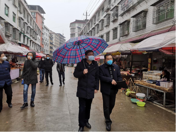 副县长伍亮(右二)在农贸市场察看指导疫情防控工作