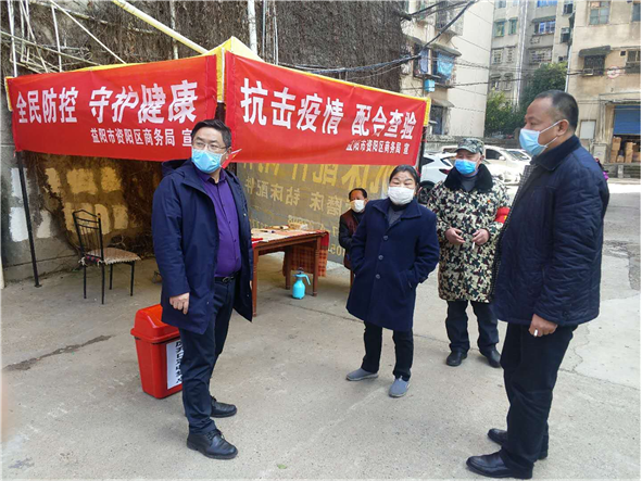 局党工委书记、局长何顺在检查疫情防控工作 1.局党工委领头羊:“关键时刻,领导干部必须带头!” “叮铃铃......”,大年三十上午,正在局值班室值班的我接到了局长何顺的电话,“你到步步高马良店来,我们一起检查一下超市的疫情防控和物资保供情况。”放下电话,我有些意外。来到超市,他早就到了,正在仔细的询问负责人超市营业时间、货物储备、商品价格等方面的情况,并且再三叮嘱一定要确保物质供应充足,千万不能随意涨价。针对疫情防控,明确要求超市每天做好卫生保洁和日常消毒,设置体温检测点,从业人员佩戴口罩上岗。当时的疫情防控局势远没有后来那么紧张,各项工作也没有统一的标准和要求。但后来的事实证明,何局长所提的这些工作要求,是很有前瞻性的。大年初二,上级要求取消春节休假后,他已经连续二十多天一直和全局干职工一起,奋战在疫情防控第一线。商务系统的疫情防控点多面广,任务很重,加上还要承担全区生活必需品市场保供工作,作为单位的一把手,压力很大。但他每天总是斗志昂扬地带领着大家开展各项防控工作,用自己的行动很好地诠释了怎样才是“务实”的领导干部。笔者永远记得他在全局干职工疫情防控工作部署会上铿锵有力的话:“在抗击疫情的关键时刻,局党工委班子所有领导干部必须带头冲在第一线!”