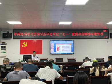 根据市委党史学习教育领导小组关于在全市组织开展习近平总书记“七一”重要讲话精神宣讲工作的通知要求,结合九月份主题党日活动安排,9月13日,市商务局组织开展学习贯彻习近平总书记“七一”重要讲话精神专题宣讲。此次宣讲会邀请市委宣讲团成员、市委宣传部三级调研员唐顺祥同志为系统党员干部作专题宣讲报告。