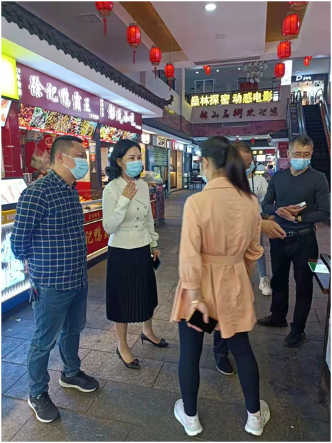 王艳一行重点对场所码的扫码进场情况,出入口值守人员测体温、验双码、查戴口罩等值守情况,以及市场商场内从业人员戴口罩情况进行督导检查并发放督查通报。对督查中发现问题较多的万木春商场、三里桥农贸市场等勒令限期整改到位,对万达、步步高等防控措施落实情况较好的场所进行通报表扬,同时勉励未督查到的重点场所见贤思齐,严格落实疫情防控措施。
