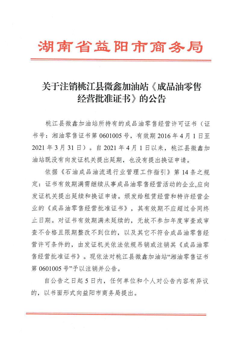 关于注销桃江县微鑫加油站《成品油零售经营批准证书》的公告 |