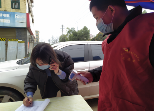 执勤点志愿者测量出入人员体温并进行登记