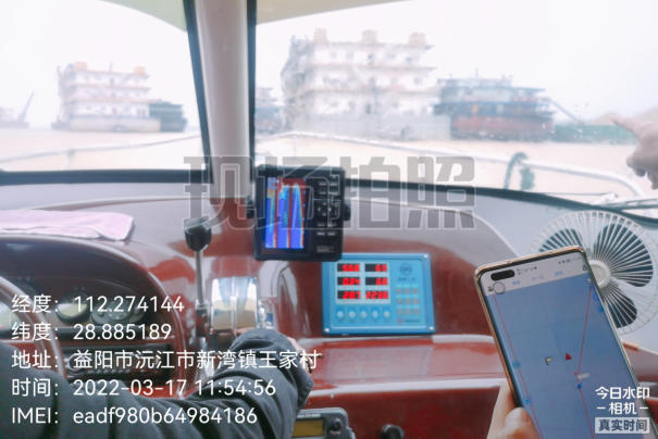图为检查人员现场核实采砂工程船作业位置