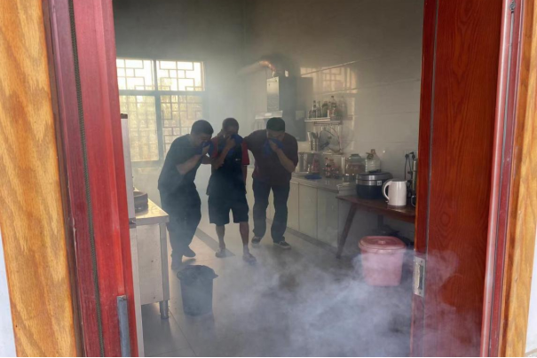 随后食堂冒出滚滚浓烟,伴随一阵呼救声,演练正式开始。总指挥吴勇同志一声令下:“启动消防应急预案!”。各应急小组紧急集合,救援组迅速前往食堂对被困人员进行施救,并有序撤离到安全位置;灭火抢险组拿起灭火器,在火源上风位置对准火源根部点喷灭火,将火势迅速扑灭。整场演练分工有序,忙而不乱,配合默契,充分展示了北部补水全体干部职工的快速反应能力和救援处置实力。